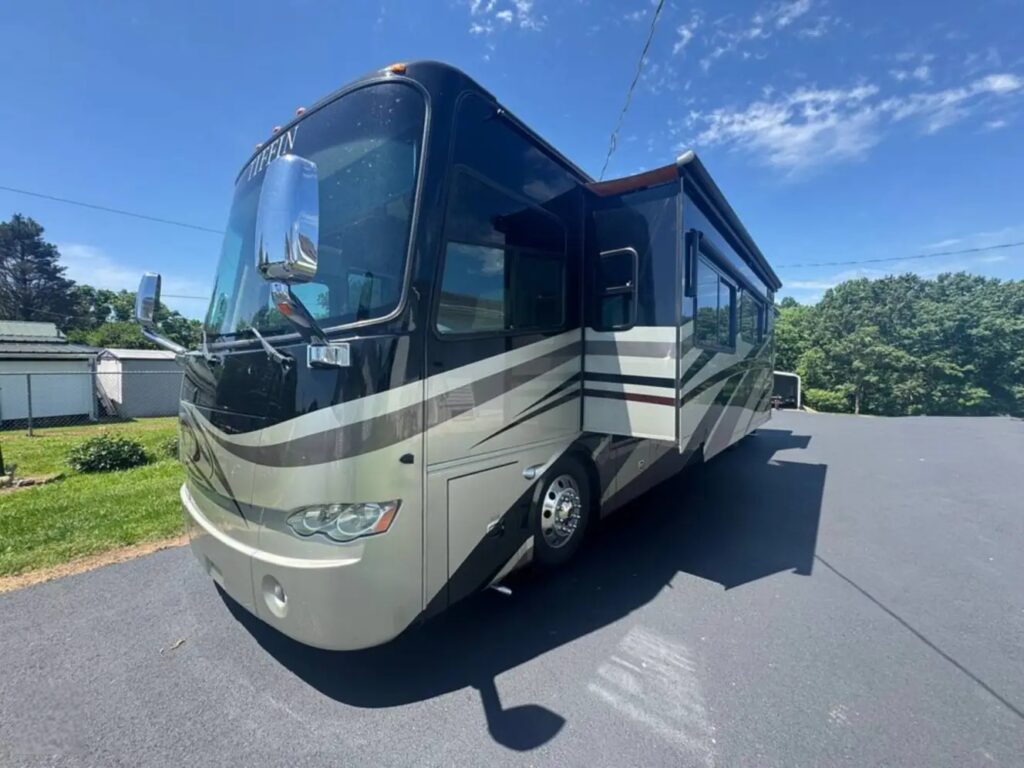 This 2010 Tiffin Allegro Bus 40QXP is a well-maintained Class A diesel motorhome with a Cummins ISL 8.9L engine producing 360 HP and has 78,000 miles. With four slide-outs, dual air conditioners, and a full set of amenities, it provides comfort and convenience for up to 8 passengers. Finished in tan/brown interior, this RV is ready for long trips and full-time travel.