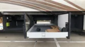 Large exterior passthrough storage compartments with pullout tray