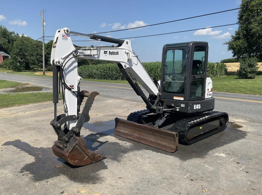 This 2016 Bobcat E45 mini excavator has 925 hours and is powered by a 42 HP diesel engine with a tracked drive system. Equipped with an enclosed ROPS cab with heat and A/C, it provides comfort and control for a variety of excavation tasks.